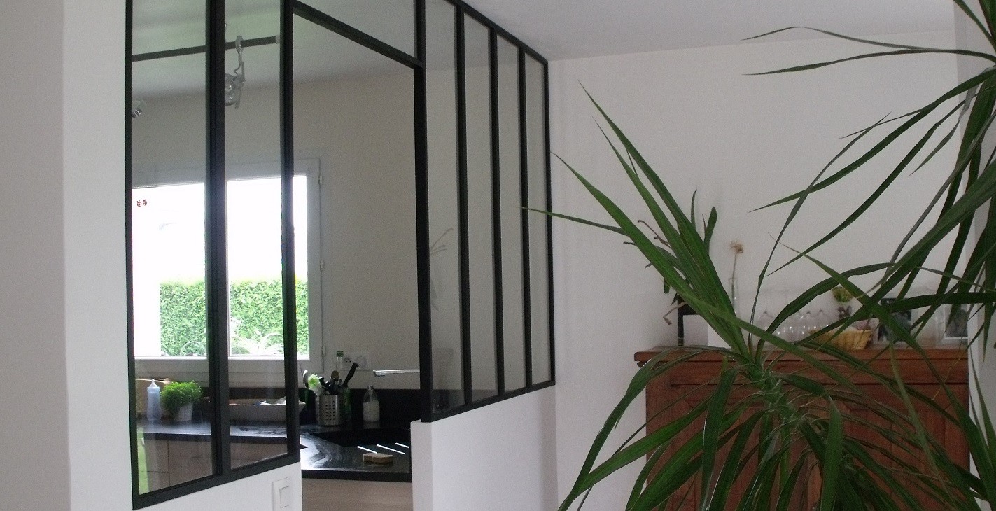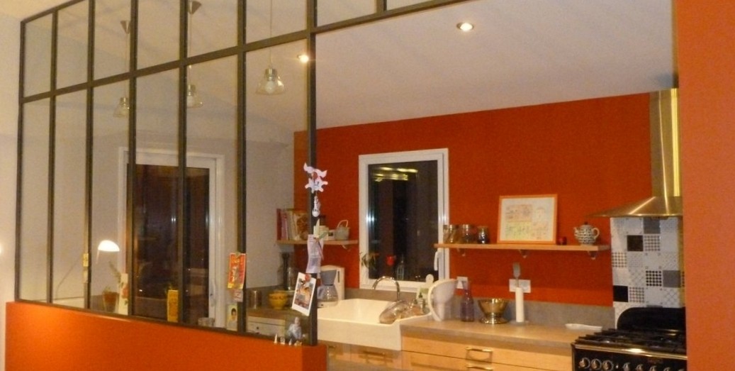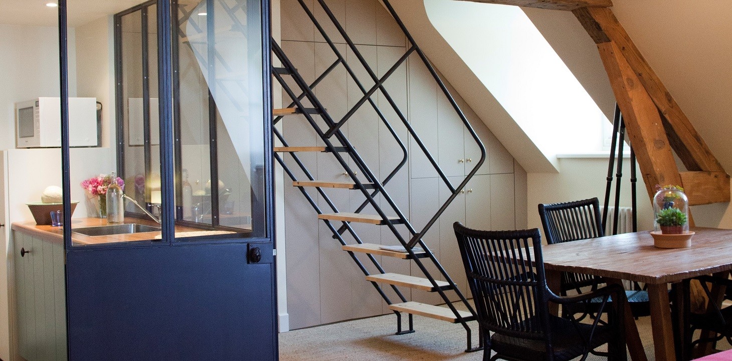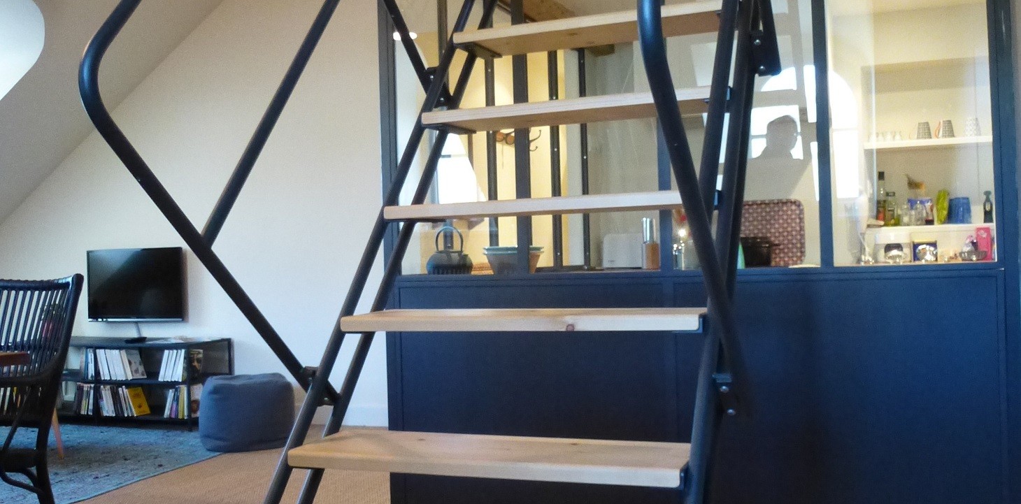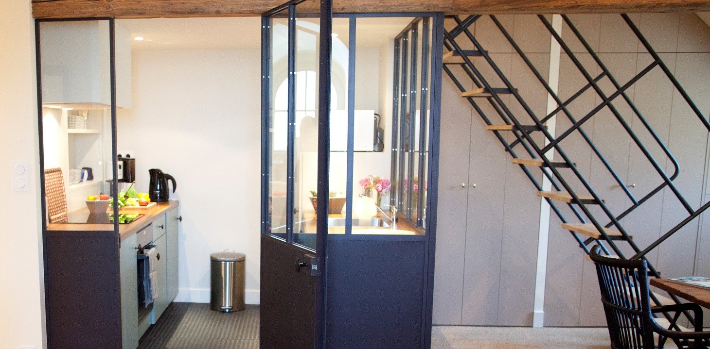Cloisons et porte métalliques vitrées de la cuisine Escalier sur mezzanine